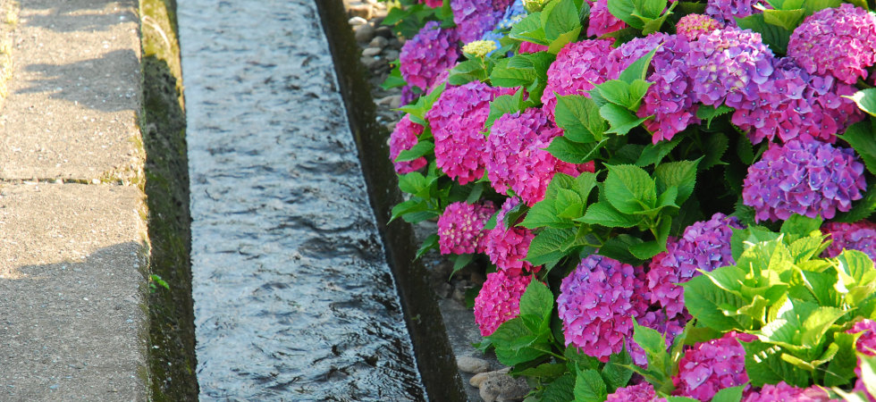 用水路沿いの美しく咲くアジサイは地域の人々の癒やしとなっています。