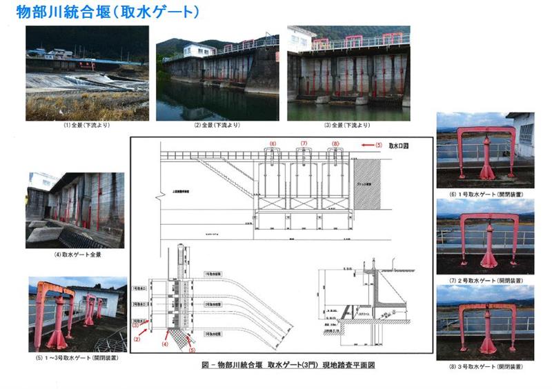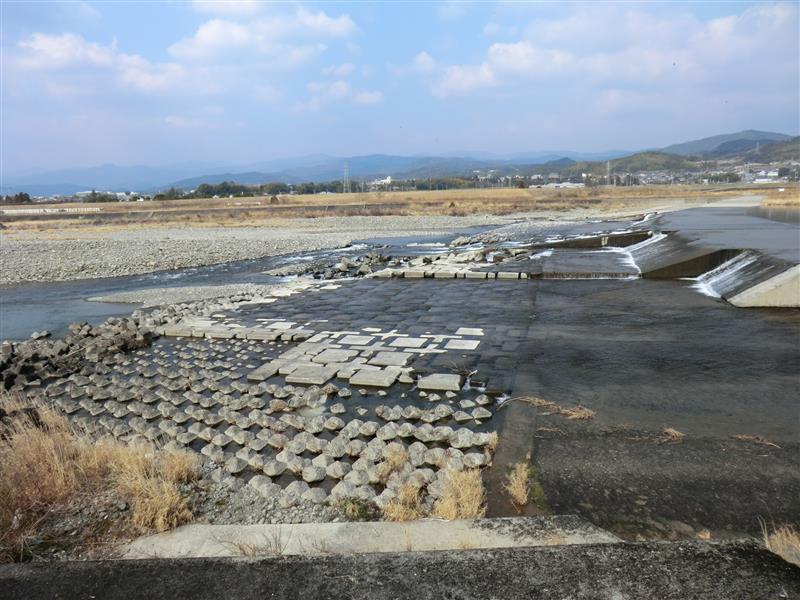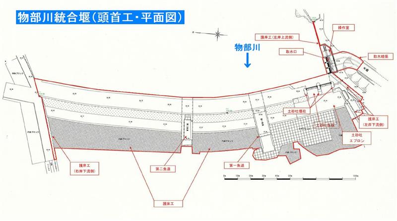 頭首工とは、河川などから,用水を取入れる農業水利施設の総称です。取水堰と取入れ口 (取水口) から成り、取水堰は用水取入れに必要な水位を確保するためのもので,本頭首工(物部川統合堰 コンクリート製の堰)の場合、土砂吐きゲート2門,魚道2箇所,取水ゲート3門、護床ブロック、その他ゲート操作室で構成されています。