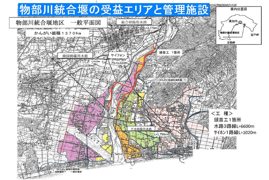 大まかには、兼山三叉以下での主要な用水路名として、原田溝、上井川、十善寺溝、町溝に分水されさらに香宗川水系烏川に一端、用水を落とし、堰(現在は可動堰)で再取水して本村用水、新宮溝、野村溝、岩崎溝、遠山溝に導水していくなど複雑な水路網システムが古来より整っています。また、下井幹線用水路は下井川、瀬戸川によって配水され、南国市分は物部川の地下サイフォンによって配水し、南国幹線用水路を経て、高知龍馬空港周辺の農地まで配水しています。これら当連合の管理水路区間外は各々の水利組織等によって管理しています。(受益エリア図をご参照願います。)